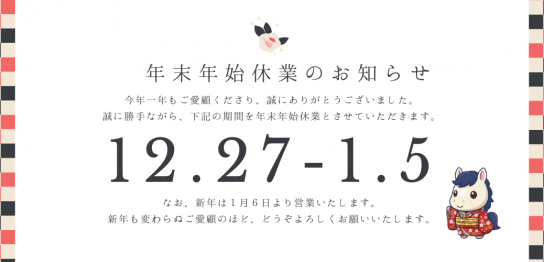 🎍 年末年始の休業のお知らせ 誠に勝手ながら、当社では下記の期間を年末年始休業とさせていただきます。